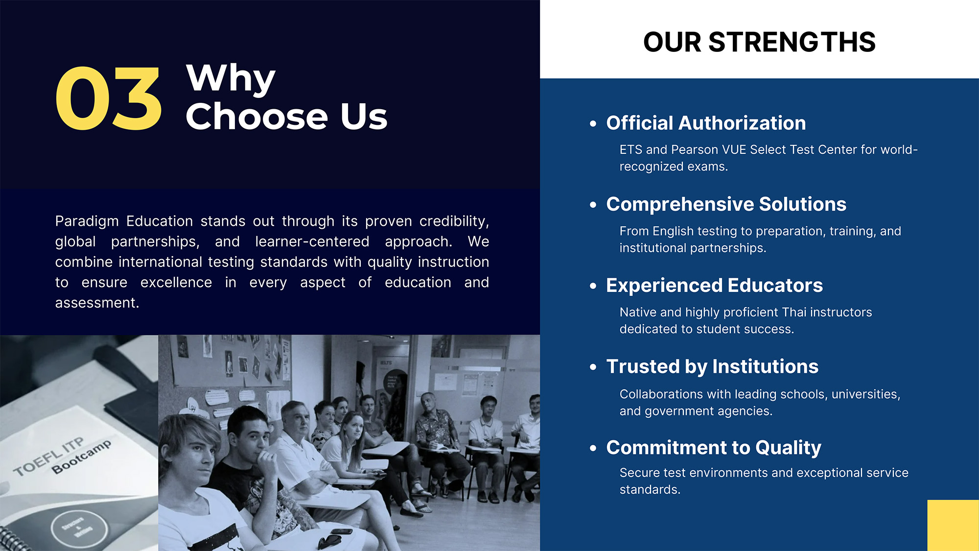 พาราไดม์ เอ็ดดูเคชัน ให้บริการหลักสูตรภาษาและการเตรียมสอบอย่างครบวงจรที่ตอบโจทย์ความต้องการของผู้เรียน เรามุ่งเน้นคุณภาพการสอนและการพัฒนาหลักสูตรเพื่อให้ผู้เรียนนำไปใช้ได้จริงในชีวิตประจำวัน