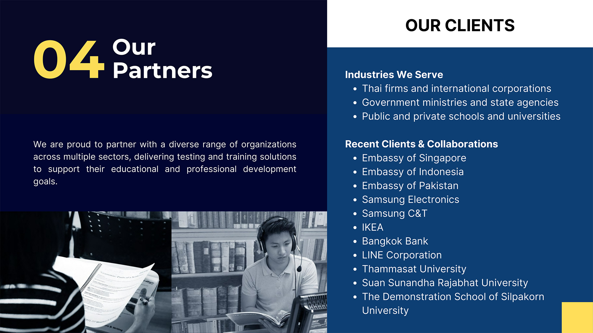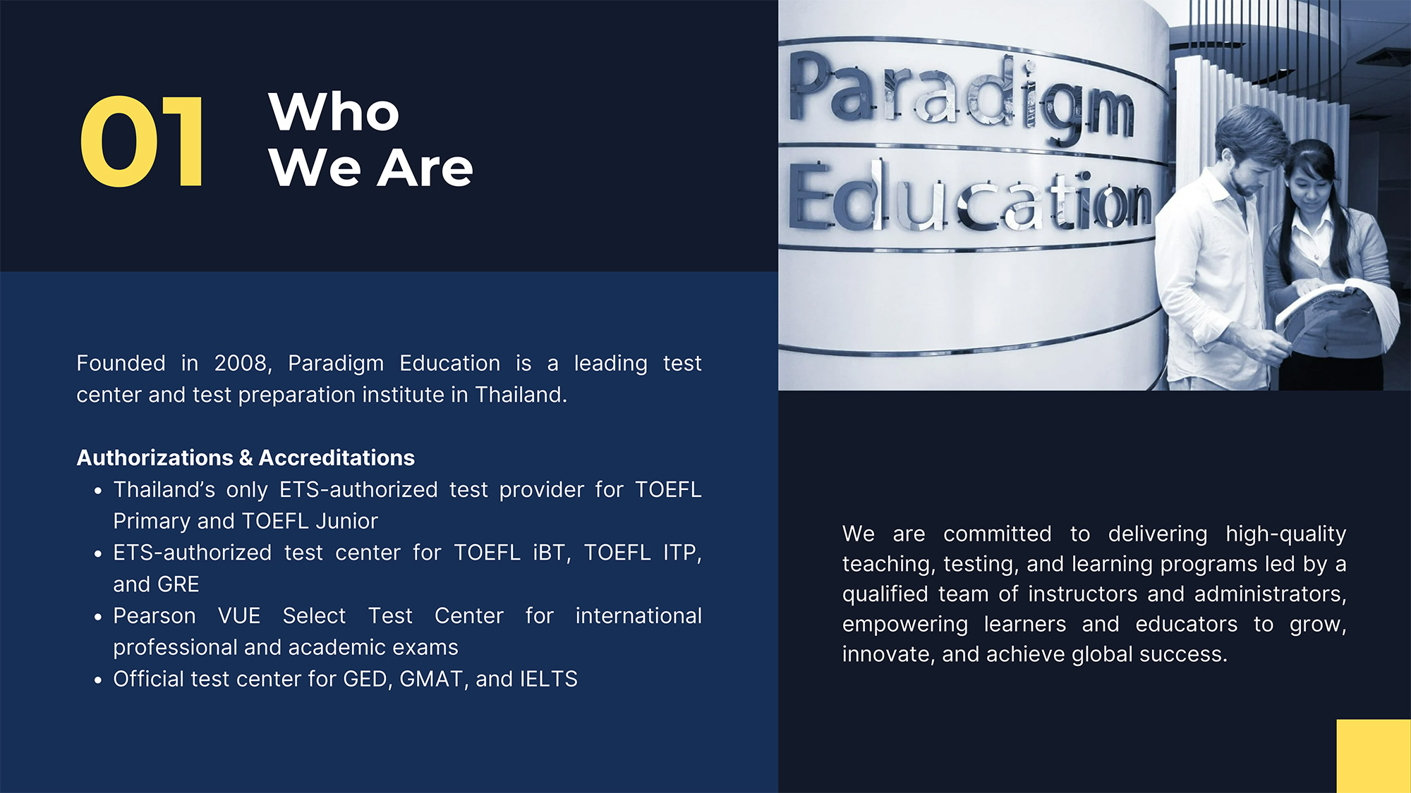 ตั้งแต่ปี 2012 พาราไดม์ได้รับความไว้วางใจในฐานะศูนย์สอบและสถาบันฝึกอบรมภาษาชั้นนำสำหรับหน่วยงานราชการ ธุรกิจ และบุคคลทั่วไป