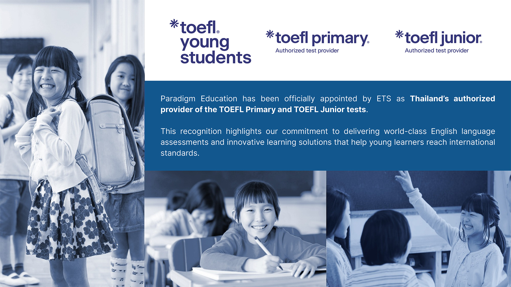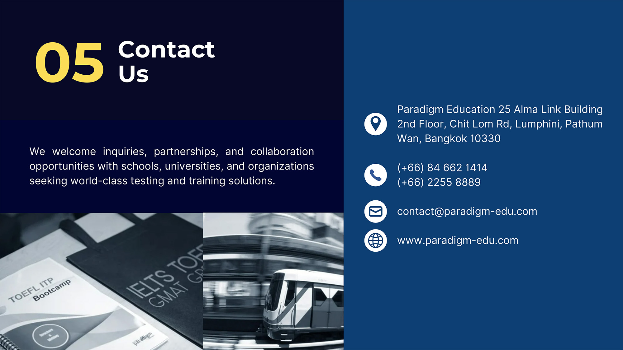 In addition, Paradigm is an official test center, offering IELTS (Computer & Paper), GED, TOEFL iBT®, TOEFL ITP®, GMAT, and GRE® exams. Conveniently located near Central Chidlom and BTS Chidlom, our private, modern test center provides a professional and comfortable environment for all test-takers.