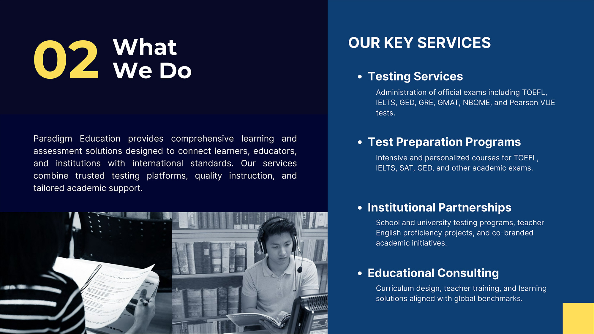 Paradigm Education offers comprehensive language and test preparation courses, tailored to the needs of learners. We focus on high-quality teaching, curriculum development, and modern learning materials to ensure practical, applicable skills.