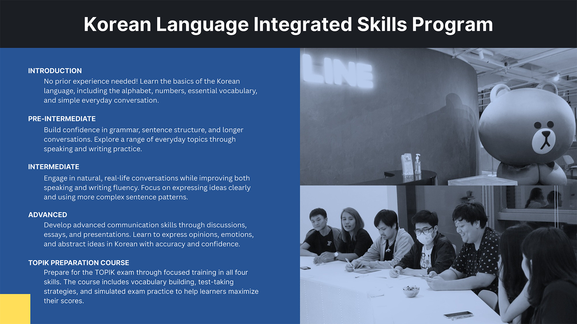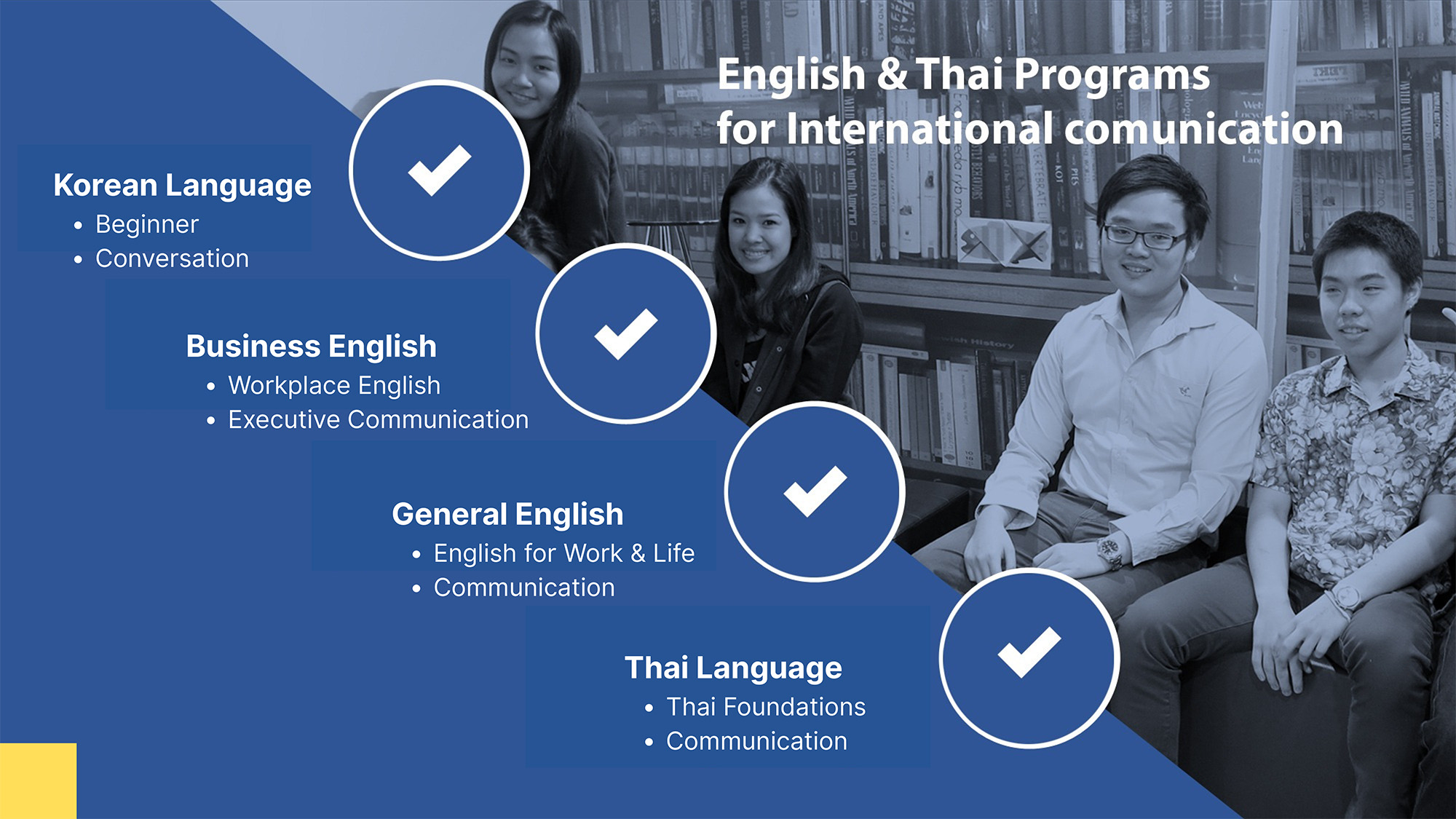 หลักสูตรของเราประกอบด้วย ภาษาอังกฤษ ภาษาเกาหลี และภาษาไทยสำหรับชาวต่างชาติ รวมถึงหลักสูตรเตรียมสอบ IELTS, IGCSE, IB, A-Level, GED, SSAT, SAT, GMAT, GRE® และ TOEFL® สำหรับผู้ที่ต้องการศึกษาต่อทั้งในประเทศและต่างประเทศ
