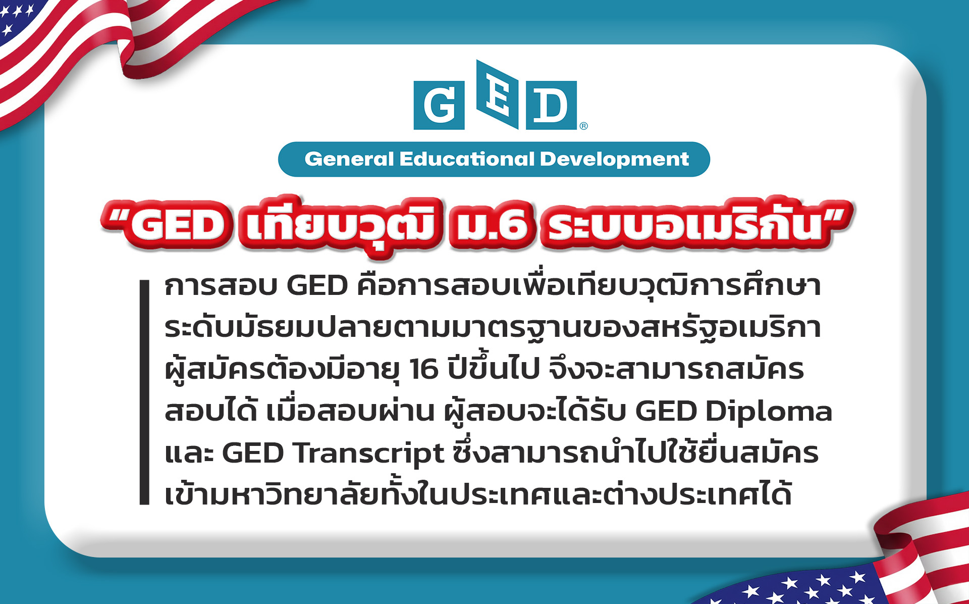 | 1 | การสอบ GED คืออะไร ? | GED (The General Educational Development) คือการสอบเทียบวุฒิการศึกษาระดับชั้นมัธยมศึกษาปีที่ 6 ของประเทศอเมริกา โดยเมื่อนักเรียนสอบแล้วจะได้รับใบประกาศนียบัตรซึ่งสามารถนำไปยื่นสมัครเข้าเรียนในระดับอุดมศึกษาได้ โดยในปัจจุบันวุฒิ GED เป็นที่ยอมรับทั้งจากมหาวิทยาลัยต่างๆในไทยและทั่วโลก |