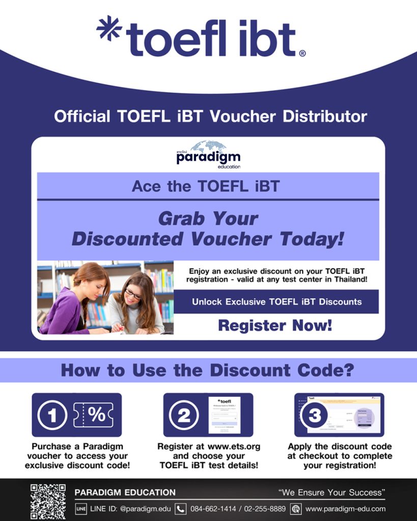 📣 Paradigm Education ตัวแทนจำหน่ายรหัสสอบ TOEFL iBT (Official TOEFL iBT Voucher Distributor) อย่างเป็นทางการในประเทศไทย