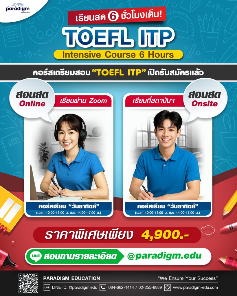 | TOEFL ITP Intensive (Onsite Course) | 6 | ติดต่อเจ้าหน้าที่ |